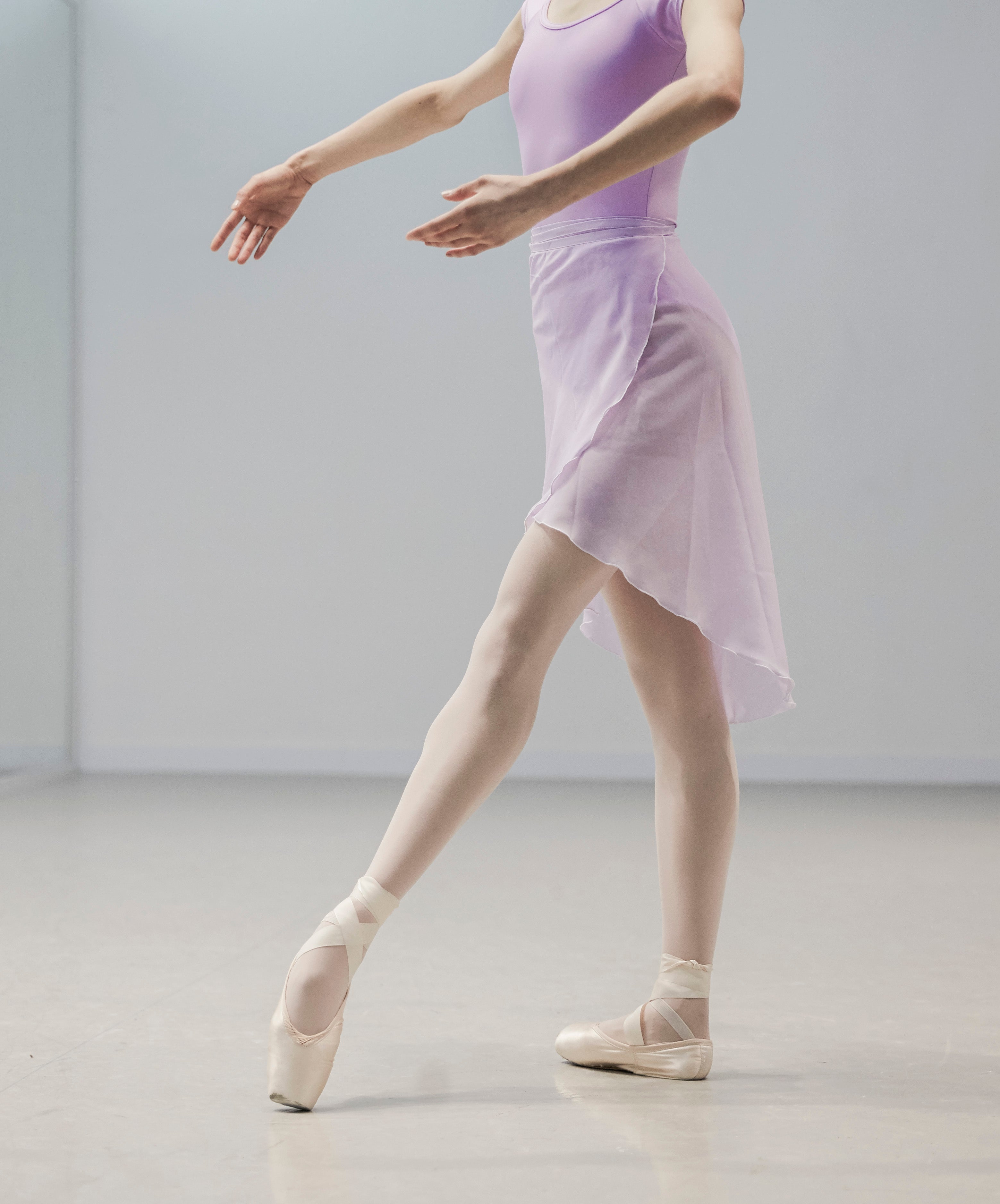 Ballet shoes should feel like a sock, almost part of your foot. They should hug your feet comfortably with no extra space at the toes or heel, allowing you to sense the floor beneath you while giving enough room to point and flex with ease.